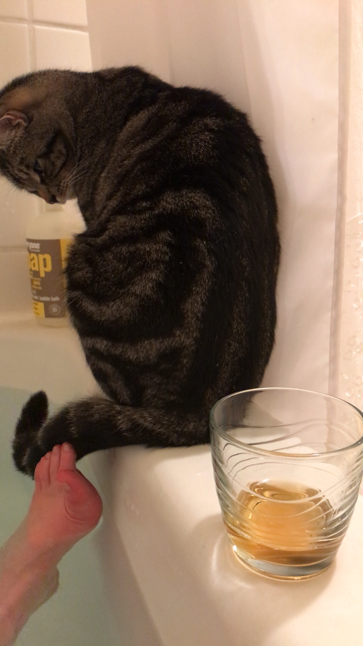 I go to pour myself a bourbon but there’s only a tiny bit left in the bottle, so I add some Drambuie and call it good. It’s not really that good, but it’s officially permanent happy hour so I drink it in the tub. The cats keep me company.